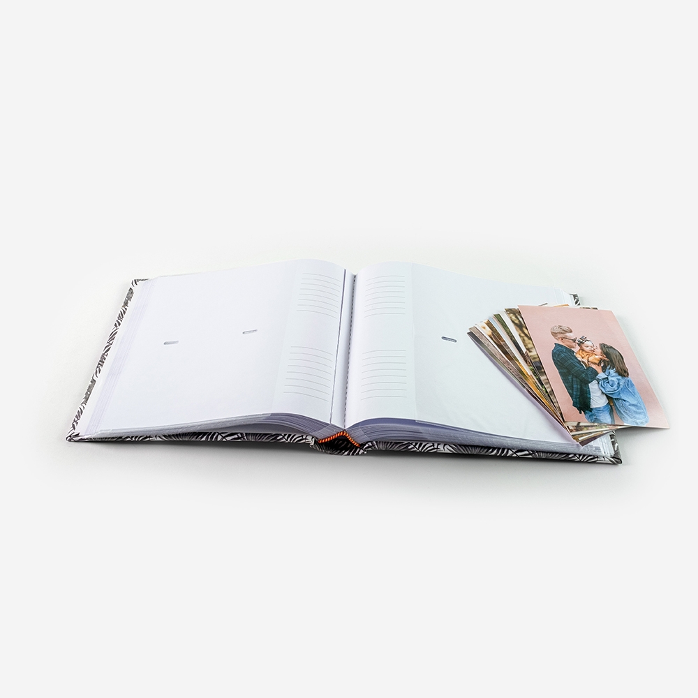 O Álbum Analógico Tropical tem capacidade para 200 fotos 10x15cm. Cada página tem espaço para 2 fotos e uma parte dedicada para escrever notas.