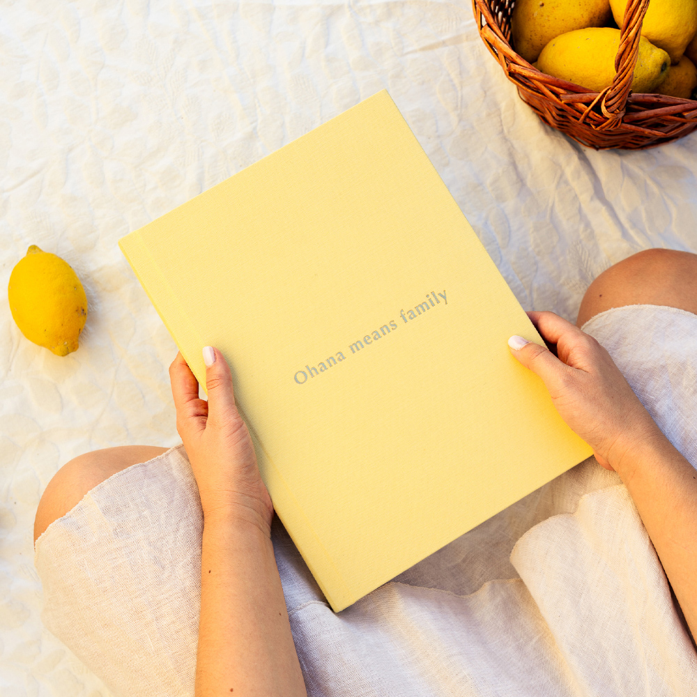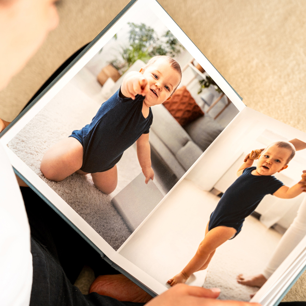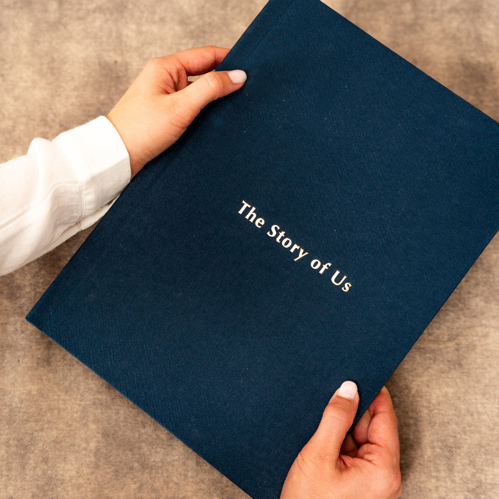 No modelo Inscription, a capa ganha uma assinatura própria. A técnica de stamping grava nomes, datas ou pequenas frases diretamente no tecido, criando um relevo subtil e elegante que transforma o álbum num objeto ainda mais ligado à história que guarda.