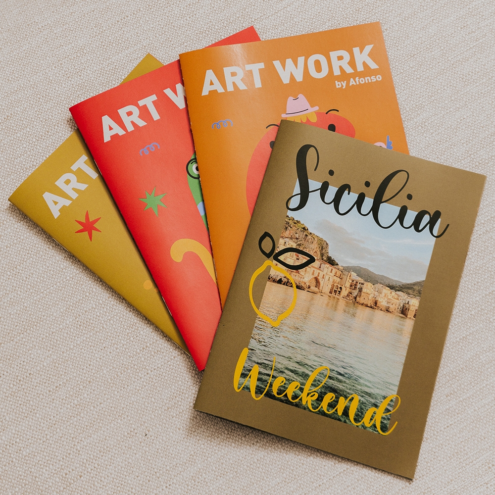 Impresso em papel couché de 135g com acabamento matte, garantindo um toque premium.